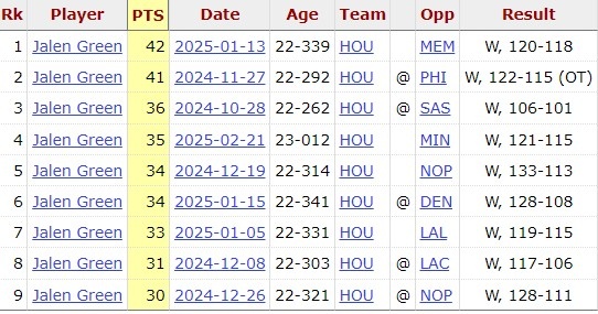 据统计,这是杰伦-格林本赛季第10场30+,而这10场火箭全胜!
