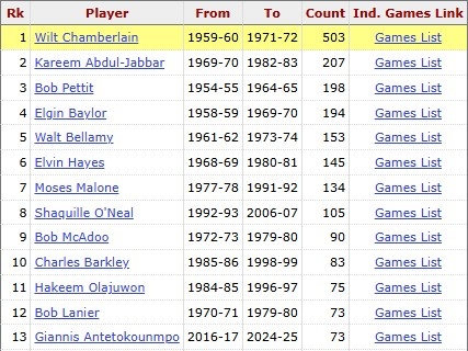而在NBA历史上,字母哥的74次能排在NBA第12名,具体排名如下: