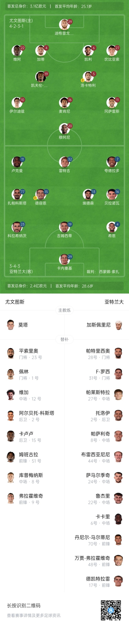 亚特兰大替补:28-帕特里西奥、31-F-罗西、2-托洛伊、22-鲁杰里、6-卡卡里、8-帕萨利奇、24-萨马尔季奇、44-布雷西亚尼尼、17-德凯特拉雷、27-帕莱斯特拉、48-万贾-弗拉霍维奇、70-丹尼尔-马尔蒂尼