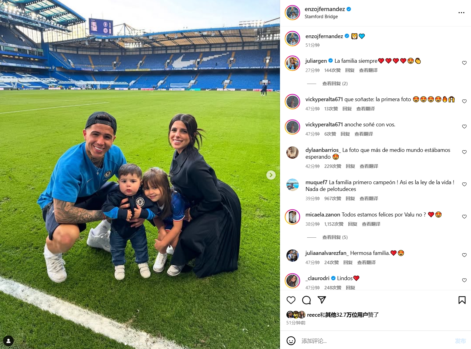 此前恩佐曾与瓦伦蒂娜分居,但随后两人又重新在一起,今天,恩佐就晒出了两人与俩孩子在切尔西主场的合照,看起来满脸幸福。