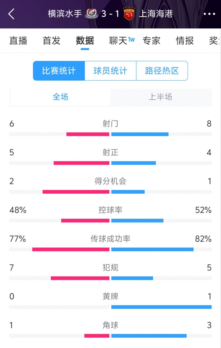半场数据方面,射门数海港8-6领先,射正4-5落后,控球率52%、传球成功率82%均高于横滨。