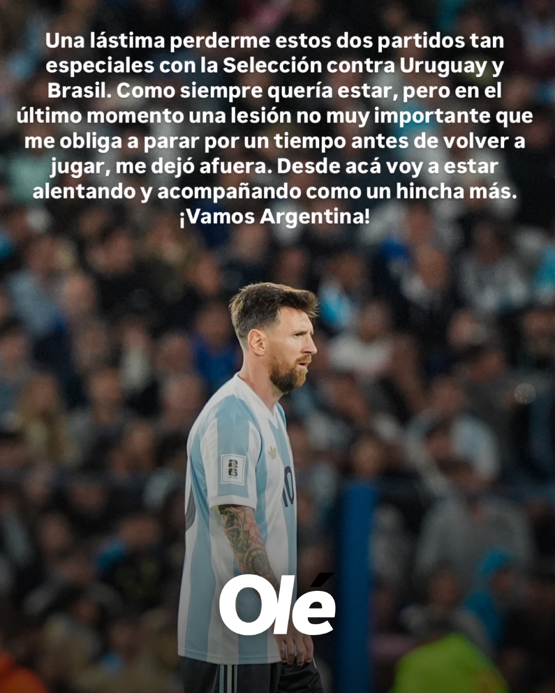 随后,梅西在社媒上发文表示:“非常遗憾我将错过与乌拉圭和巴西的两场比赛。尽管我始终渴望参赛,但最后一刻出现的轻微伤势迫使我必须休养一段时间才能重返赛场,这让我无法参与此次赛事。在此我将作为一名普通球迷继续为球队加油助威。阿根廷加油!”